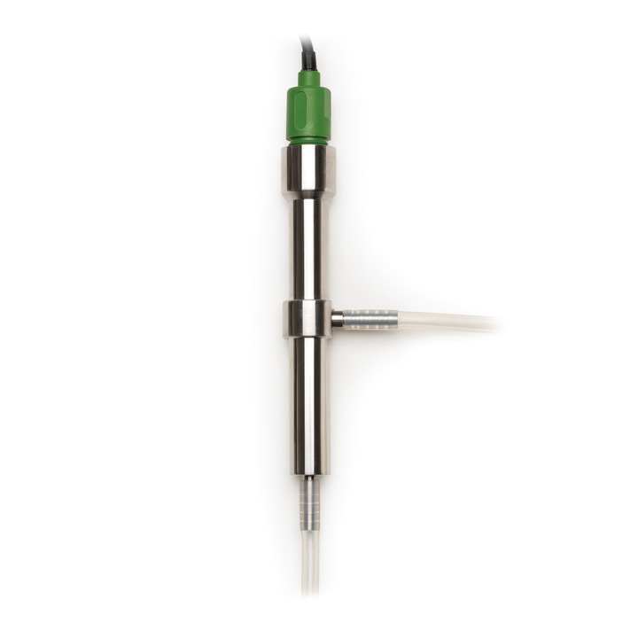 Die Messung der Leitfähigkeit hochreinen Wassers, wie es für die Stromerzeugung, der Halbleiterherstellung, medizinische Zwecke und andere Anwendungen benötigt wird, kann eine beachtliche Herausforderung darstellen. Dies liegt daran, dass unter normalen Bedingung eine Diffusion von atmosphärischem Kohlendioxid (CO2) in Wasser stattfindet, was zur Bildung von Kohlensäure (H2CO3) führt. Diese dissoziert schnell in Wasserstoffionen (H+) und Hydrogenkarbonationen (HCO3-). Diese Ionen erhöhen die Leitfähigkeit und verringern den Widerstand des Wassers, was sich im Falle von hochreinem Wasser in einem Messfehler äußert. Um die Leitfähigkeit von dieser Art Wasser korrekt betimmen zu können, ist es notwendig das Wasser im Fluss zu messen. Das HI98197 verwendet hierzu die Vier-Ring-Leitfähigkeitssonde HI763123 die mit der Edelstahl-Durchflusszelle HI605453 dicht verschraubt werden kann. Diese Durchflusszelle wird dann mit der Wasserquelle verbunden, um so die Leitfähigkeit und den Widerstand ohne Einfluss der Umgebungsluft genauer bestimmen zu können. Das HI98197 ist somit das ideale Instrument, die Funktion einer Porduktionsanlage für deionisiertes Wasser mit einem Widerstand von 18,2 MΩ bei 25 °C zu überwachen.