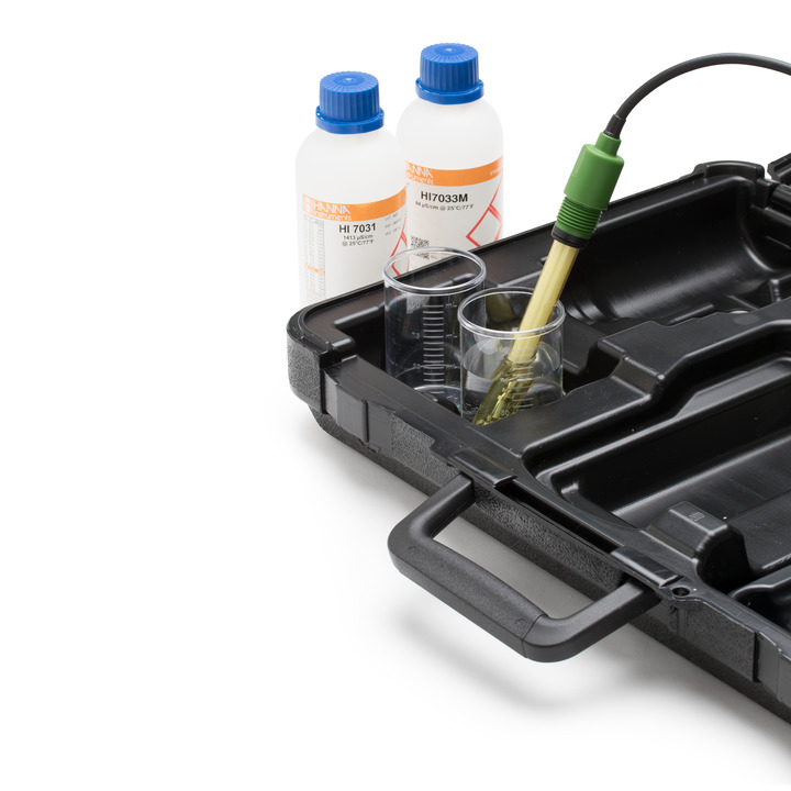Das HI98197 wird geliefert mit der Vier-Ring-Leitfähigkeitssonde HI763123; HI605453 Edelstahl-Durchflusszelle für ultrareines Wasser, Schläuchen, HI7031M 1413 µS/cm Kalibrierlösung (230 mL); HI7033 84 µS/cm Kalibrierlösung (230 mL); 100 mL Kunststoffbechergläser (2); HI92000 PC-Software; HI92015 Mikro-USB-Kabel; 1,5 V AA-Batterien (4); Kurzanleitung; Benutzerhandbuch und Qualitätszertifikat im stabilen Tragekoffer HI720197 mit speziellem Einsatz.