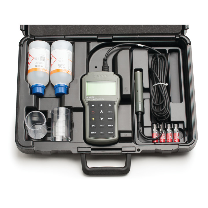Das HI98192 wird geliefert mit der Vier-Ring-Leitfähigkeitssonde HI763133; HI7031M 1413 µS/cm Kalibrierlösung (230 mL); HI7035 111,8 mS/cm Kalibrierlösung (230 mL); 100 mL Kunststoffbechergläser (2); HI92000 PC-Software; HI92015 Mikro-USB-Kabel; 1,5 V AA-Batterien (4); Kurzanleitung; Benutzerhandbuch und Qualitätszertifikat im stabilen Tragekoffer HI720192 mit speziellem Einsatz.