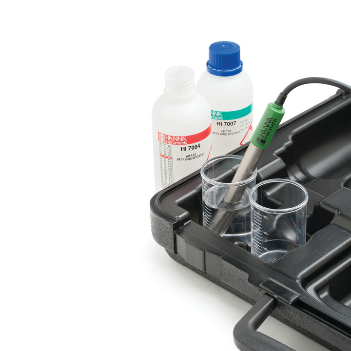 Das HI98190 wird geliefert mit der pH-Elektrode HI12963 (nicht Variante HI98190-03); HI7004M pH 4,01 Pufferlösung (230 mL); HI7007 pH 7,01 Pufferlösung (230 mL); Beutel mit Elektrodenreiniger (2); 100 mL Kunststoffbechergläser (2); HI92000 PC-Software; HI92015 Mikro-USB-Kabel; 1,5 V AA-Batterien (4); Kurzanleitung; Benutzerhandbuch und Qualitätszertifikat im stabilen Tragekoffer HI720190 mit speziellem Einsatz.
