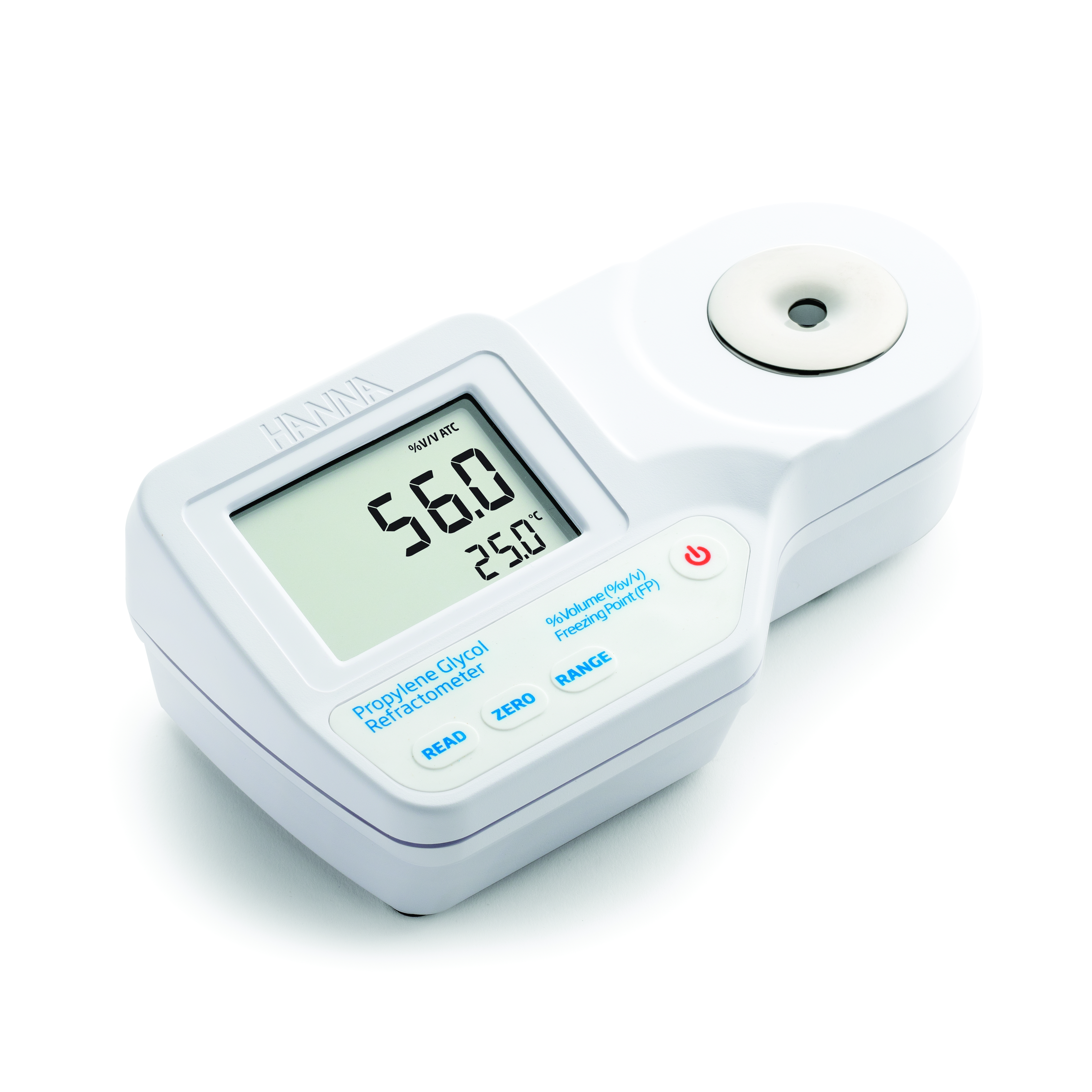 Das Digital-Refraktometer HI 96832 bestimmt nach dem Prinzip der refraktiven Indexmessung den Volumengehalt und Gefrierpunkt von Gemischen aus Propylenglykol. Das Gerät ist einfach zu bedienen und garantiert sekundenschnelle sowie sichere Messungen.